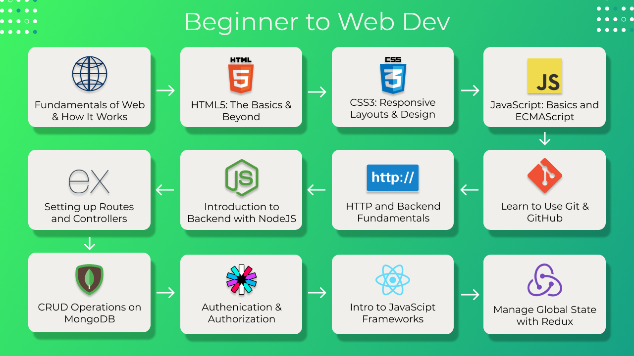 در مطالبی که گفته شد، نکات بسیار خوبی برای یادگیری وجود داشت. اما نکته خوب این است که شما نیازی به یادآوری هیچ یک از آنها ندارید. چراکه توسعه دهندگان با عمل کار یاد میگیرند، نه با حفظ کردن مطالب! بنابراین باید از خود بپرسید که چگونه میتوانید یک توسعه دهنده MERN Stack شوید. این مهمترین قسمت این مقاله خواهد بود، جایی که من نقشه راه شخصی خود را در اختیار شما قرار میدهم تا بتوانید از آن الهام گرفته و سفر خود را آغاز کنید. چه در توسعه وب تازه وارد باشید و چه بخواهید از فناوریهای دیگر استفاده کنید.