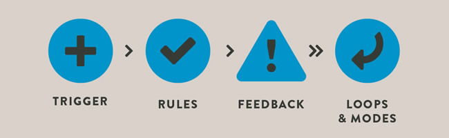 FeedBack : این آیتم به ما اطلاعاتی را راجب به چگونه کار کردن trigger و آشنایی با فعالیت های ریز تعاملات می دهد. برای مثال ویبره موبایل شما در هنگام سایلنت کردن موبایل یک فییدبک است. این آیتم به شما آگاهی می دهد که trigger و قوانین به درستی اجرا شده اند. بدون این آیتم شما متوجه نخواهید شد که چه اتفاقی روی می دهد. زمانی که شما موبایل تان را روی حالت سایلنت قرار بدهید و ویبره ای به شما داده نشود، متوجه می شوید که یکجای کار اشکال دارد.