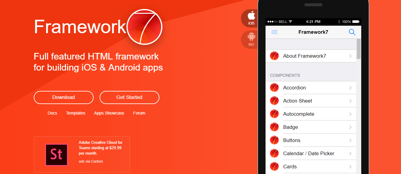 Framework7 یک فریمورک HTML رایگان و متن باز است که به توسعهدهندگان اجازه میدهد تا بتوانند اپلیکیشنهای موبایل هیبریدی را مشابه با اپلیکیشنهای آندروید و آیاواس ایجاد کنند. همچنین همراه با این فریمورک یک ابزار نمونهسازی نیز وجود دارد که به شما در امر نمونهسازی کمک میکند. Framework7 مستندات بسیار ساده و واضحی دارد که به شما کمک میکند تنها با داشتن دانش HTML/CSS و Javascript اپلیکیشنهایتان را ایجاد بکنید. این فریمورک بیشتر روی طراحی متریال تاکید دارد.