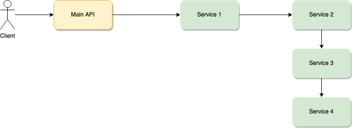 تفاوت اصلی در اینجا این است که منطق کسب و کارتان به دلایلی شما را ملزم میکند که چندین سرویس را بهم پیوند دهید. این بدان معناست که برای انجام تعامل API کلاینت، درخواست باید از Main API به Service 1 سپس از Service 1 به Service 2 و بعد از Service 2 به Service 3 برسد، در نهایت برای ارائه پاسخ واقعی از Service 3 به Service 4 پیش میرود که به نوبه خود کل خدمات را مرحله به مرحله تا API اصلی برمیگرداند.