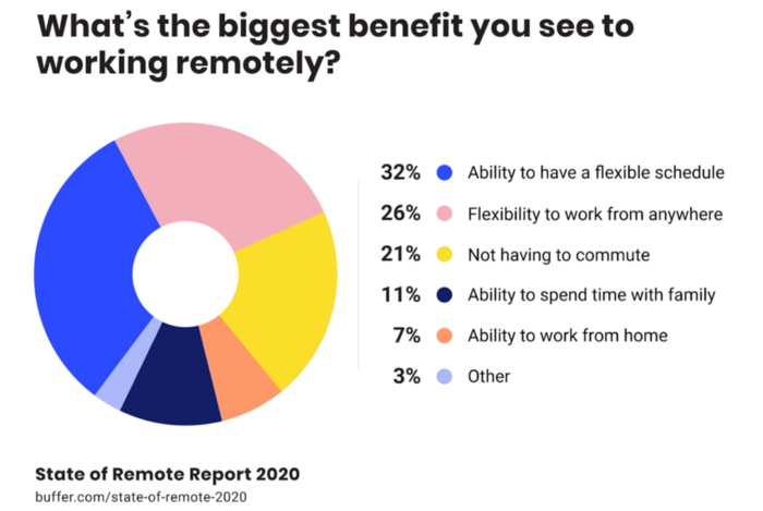 به نظر شما کدام یک از این محیطها برای کارمندان پربازدهتر خواهد بود؟ دفترکار در خانه یا اداره؟ خب به نظر میرسد ما فرصت پی بردن به این سوال را داریم. ممکن است این اوضاع برای هفتهها و یا حتی بیشتر طول بکشد. با این وجود این یک فرصت عالی برای تغییر سبک زندگی میباشد. دیگر خبری از با عجله صبحانه خوردن و دیر رسیدن به محل کار نیست. اخیراً گزارش مشترکی از بوفر و آنجلیست منتشر شده که در آن بیش از ۳۵۰۰ کارمند فنی مورد بررسی قرار گرفتهاند. این گزارش نشان میدهد که مهمترین مزیت کار از خانه، وجود یک برنامهی انعطاف پذیر، امکان کار کردن در هر مکان و عدم لزوم به رفت و آمد است.