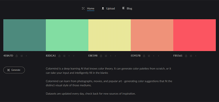 Colormind - یک وبسایت برای یادگیری تئوری های رنگ و همچنین دارننده یک پالت رنگی که برای شما ترکیب رنگ های مناسب و زیبا رو بوجود میاره
