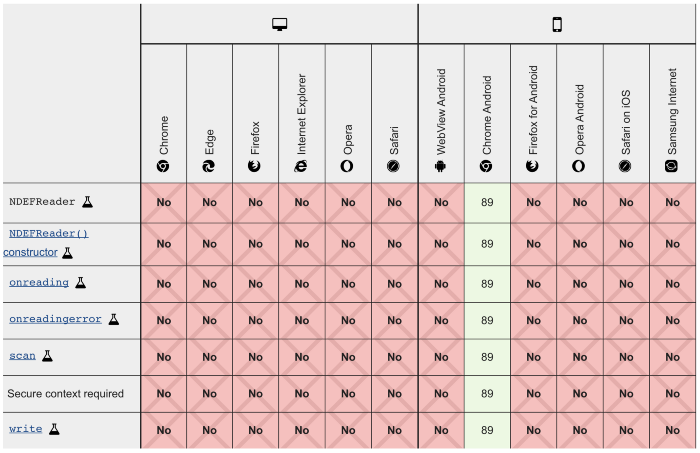 به عنوان یک اقدام امنیتی، WebNFC فقط برای فریمهای سطح بالا و کانتکستهای مرور امن (فقط HTTPS) در دسترس است.