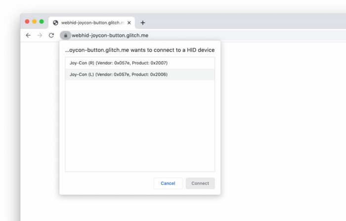 هنگامی که برنامهای WebHID را برای اتصال دستگاه پیاده سازی کرد، دستور زیر نمایش داده میشود.