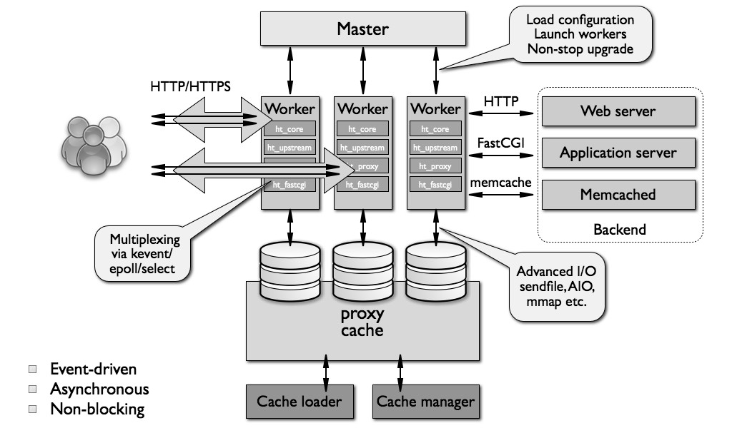 در واقع راز موفقیت در خود موتور آن است. Nginx به عنوان یک وب سرور مبتنی بر رویداد عمل میکند، به این معنی که رویدادها به worker گوش میدهند و تنها در صورت نیاز پاسخگو هستند. آرگومان ondemand در داخل nginx به سرویس اجازه میدهد تا شنوندگان را در صورت تقاضا ایجاد و حذف کند. این امر به کاهش استفاده از حافظه و افزایش کارایی کمک خواهد کرد. آپاچی ابتدا سعی کرد حالت رویداد را در mpm-event worker قرار دهد، اما در تطابق با سرعت nginx به شدت شکست خورد، زیرا آپاچی به عنوان یک وب سرور رویداد محور ساخته نشده بود.