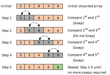 در این روش عناصر متوالی یک لیست به عن.ان مثال نام دانشجویان یک کلاس ،از ابتدای لیست با یکدیگر مقایسه شده و چنانچه مرتب نباشند جای آنها با هم عوض میشد.این عمل تاجایی ادامه میابد که نام دانشجویان بر اساس حروف الفبا از اول تا آخر مرتب شود.در هر مرحله از این مقایسه بزرگترین عنصر(در اینجا حرف بعد میباشد)به انتهای لیست منتقل میگردد.