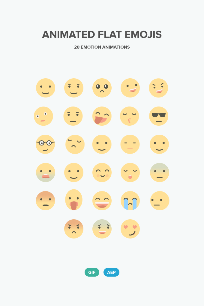 این مجموعه شامل شکلک های مختلف مثل شادی ، خنده ، گریه ، ناراحتی و ... میشه که شما به راحتی میتونید در پروژه های مختلف ازشون استفاده کنید . این مجموعه در سه سایز مختلف 32x32, 64x64, 128x128 و در دو فرمت Gif و AEP در اختیار شما قرار داده میشه که میتونید تغییرات دلخواه خودتون رو حتی با Adobe After Effects روش پیاده کنید .