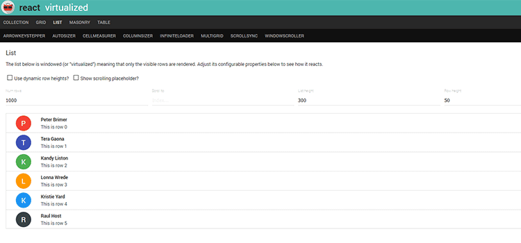 React Virtualized به شما اجازه می دهد تا به صورت زیبا و همراه با قابلیت شخصی سازی، لیست ها و جداول طولانی را رندر کنید. می توانید ردیف های ثابت یا متغیر را ایجاد کنید، در نهایت کاربران می توانند در قسمت های مختلف آن اسکرول کنند.