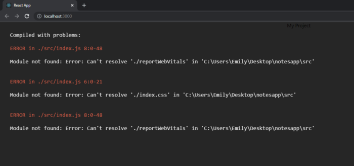 بیایید با جایگزین کردن محتویات App.js شروع کنیم تا فقط یک <div> را با رشته «My Project» برگردانیم. همچنین ایمپورت لوگو را در خط اول حذف خواهیم کرد.