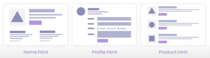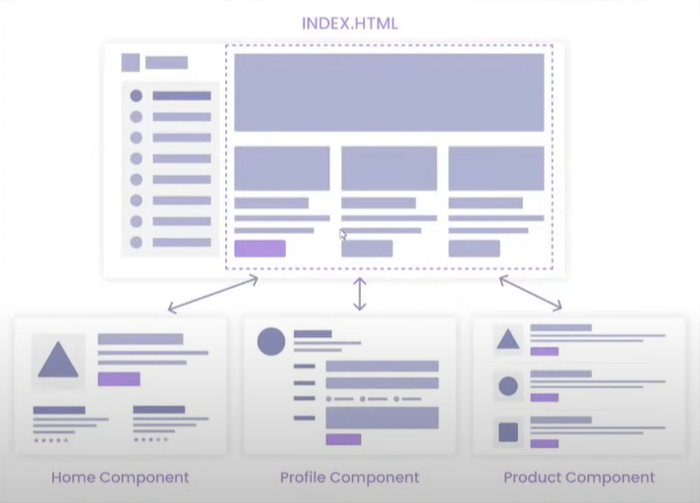 اساسا به این معنی است که برنامه از یک قالب (index.html) تشکیل شده است. هنگامی که کاربر در سایت پیمایش میکند، در واقع روی لینکهایی که شما را به قسمتهای مختلف وب سایت هدایت کرده، کلیک مینماید. اگرچه ظاهر وب سایت متفاوت به نظر میرسد و قالب ثابت است، اما کامپوننتهای صفحه (همانطور که در تصویر مشخص شده است) در حال تعویض هستند. انجام این کار به این معنی است که صفحه مجددا رفرش نمیشود و تجربه بسیار سریعتری ایجاد میکند، جایی که عناصری مانند لایکها و اعلانها میتوانند به روز شوند و به صورت زنده به نمایش درآیند.