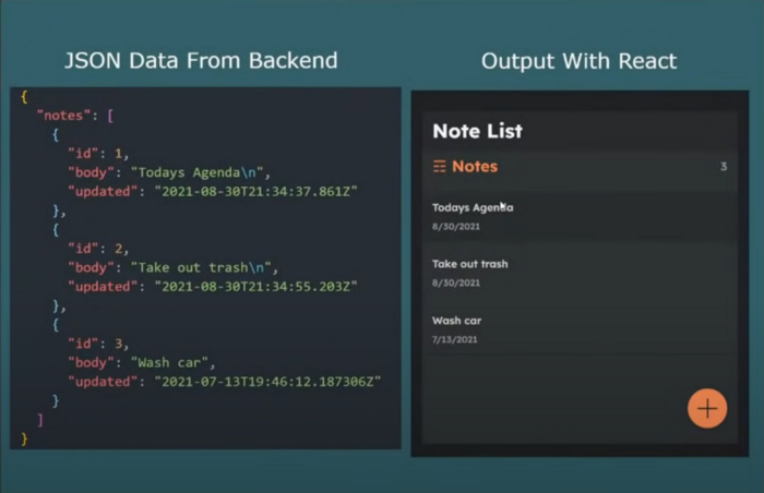 تصویر بالا (سمت چپ) دادههایی را نشان میدهد که در بک-اند ذخیره شدهاند و دیگر نیازی نیست که به عنوان فایل JSON ذخیره شوند، به این ترتیب دادهها از بک-اند به قسمت فرانت-اند واکشی میگردند. فرانت-اند از چیزی مانند fetch یا axios برای ایجاد یک درخواست HTTP به منظور دریافت این دادههای JSON استفاده کرده و از تعامل با API و البته رندر کردن دادهها (سمت راست) مراقبت میکند.