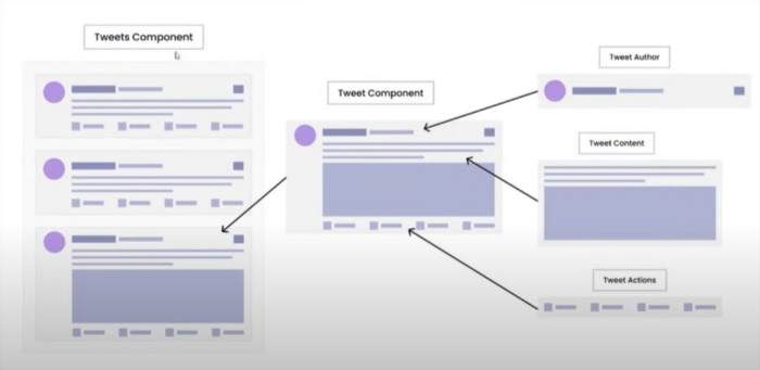 چرا که آنها میتوانند تودرتو هم باشند. مثلا کامپوننت Feed را در نظر بگیرید که خود از کامپوننتهای Tweet Author، Tweet Content و Tweet Actions تشکیل شده است.