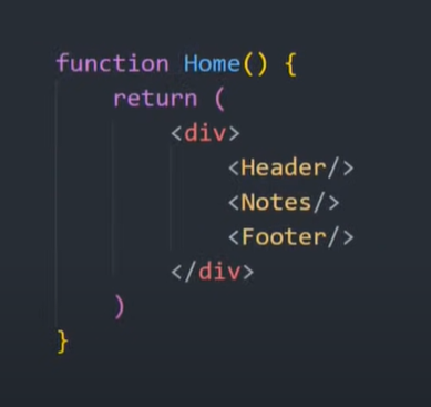 یک صفحه ممکن است شبیه چیزی باشد که در زیر نشان داده شده است، جایی که ما دوباره از یک تابع برای تعریف کامپوننت Home استفاده میکنیم و در آن کامپوننتهای دیگری مانند Header، Notes و Footer را به صورت تودرتو قرار میدهیم.