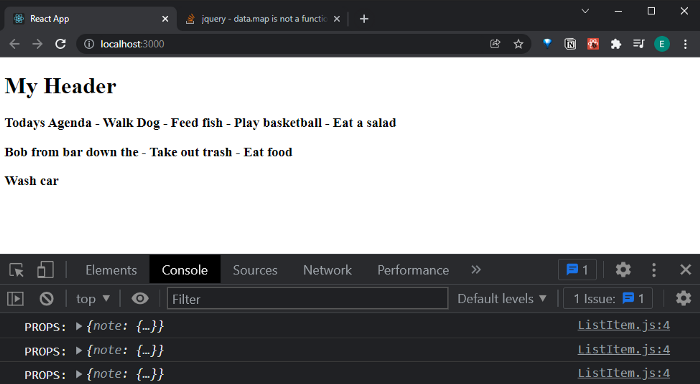 دومین چیزی که متوجه خواهید شد این است که مقدار props یک شی خالی در هر آیتم لیست خواهد بود. مشابه ویژگی key میتوانیم محتوای یادداشت را همانطور که یک ویژگی HTML سفارشی اضافه میشود، ارسال کنیم. در این حالت از آنجایی که قبلا note را از طریق تابع map استخراج کردهایم، میتوانیم شی note را به ListItem ارسال کنیم تا به محتوای آن دسترسی داشته باشیم.