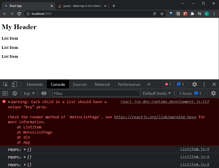 اولین چیزی که متوجه خواهید شد این است که یک خطای warning وجود دارد. دلیل خطا هم این است که داخل NotesListPage.js در حال حلقه زدن و برگرداندن هر ListItem هستیم. با این حال زمانی که ما این کار را انجام میدهیم، ریاکت باید هر آیتم را در DOM مجازی شناسایی کند. بنابراین هر زمان که یک آیتم را بهروزرسانی میکنیم، به جای بهروزرسانی هر آیتم میداند که کدام مورد را باید براساس ویژگی key تغییر دهد.