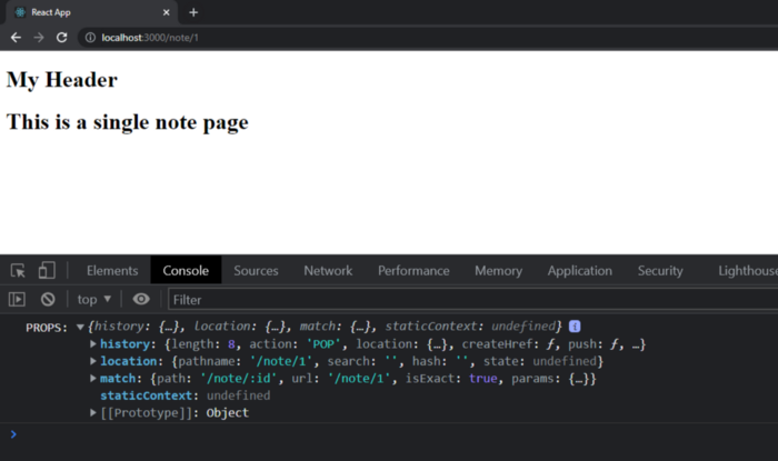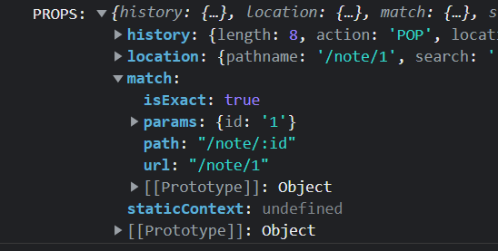 به علاوه از آنجایی که ما از Router استفاده کردیم، میتوانیم اطلاعات مسیر را از طریق propها در کامپوننت NotePage خود استخراج کنیم. بیایید نگاهی بیندازیم به آنچه که میتوانیم با ایمپورت کردن propهای خود به دست آوریم.