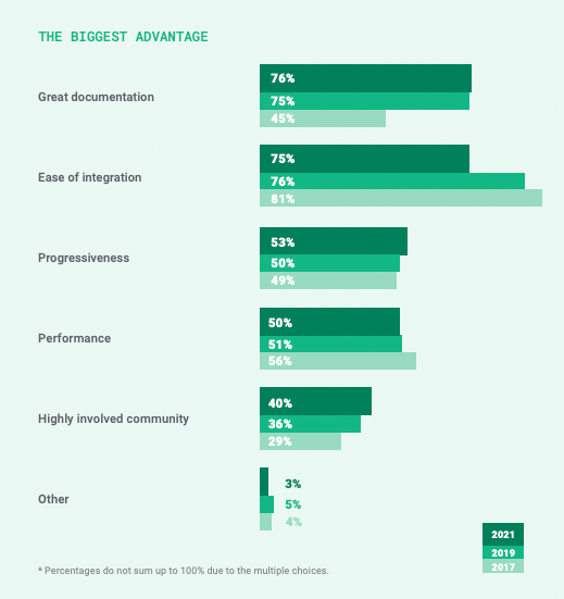 در واقع 75 درصد از توسعه دهندگان شرکتکننده در نظرسنجی گزارش وضعیت 2021، سهولت ادغام را دومین مزیت بزرگ Vue میدانند. ضمنا با وجود مستندات عالی، پیادهسازی Vue.js در یک پروژه حتی سریعتر هم میشود.