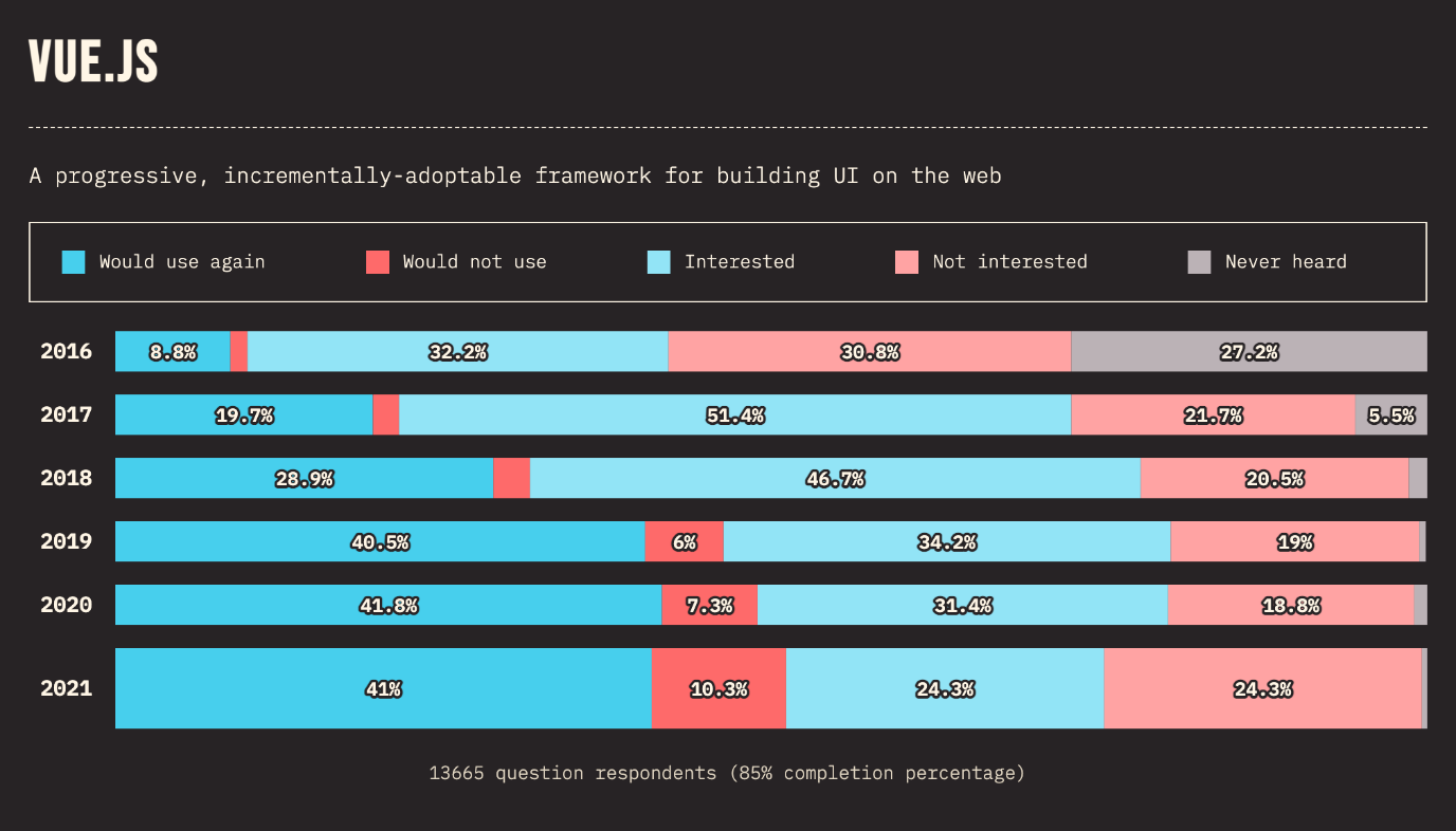 در سال 2021 این درصد به 42 افزایش یافته است که نشان میدهد Vue به طور مداوم در شرکتها مورد استفاده قرار میگیرد. بیش از 55 درصد از پاسخ دهندگان نیز متقاعد شدهاند که Vue.js طی سالهای آینده در سازمانشان محبوبیت بیشتری پیدا خواهد کرد.