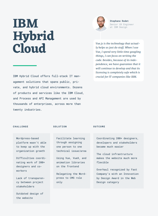 طبق گفته بن هونگ - یکی از اعضای تیم آنها: Vue در واقع نوعی کتابخانه بوده که بسیار انعطافپذیر است و با استفاده از آن تهیه نمونه اولیه از هر چیزی بسیار سریع و آسان صورت میگیرد. با این حال در لحظهای که باید آن را برای استفاده از معماری سازمانی مقیاسبندی کنید، آماده است تا بهرهوری شما را افزایش دهد و حس اطمینان حاصل نماید.