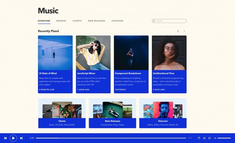 سنگ گوشه ReactJS این است که خرد کردن یک برنامه به کامپوننتهای کوچک را خلاقانهتر میکند، و هر کامپوننت جداگانه میتواند منطق مشخص خود را جدا از کامپوننتهای دیگر نگه دارد. اگر به این روش پیش برویم، میتوانیم درباره هر کامپوننت برنامه به صورت جداگانه فکر کنیم. برای مثال فکر کنید که کامپوننت آلبوم در برنامه ما میتوانست چه چیزی باشد: