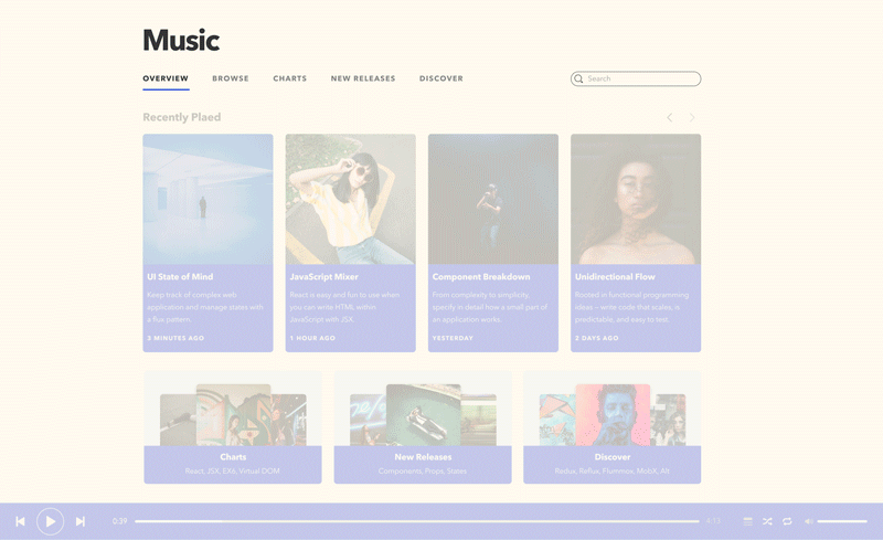 با این نوع خرد کردن، ما میتوانیم کامپوننتهای مختلفی برای هر بخش جداگانه داشته باشیم. برای مثال آلبوم، (Album) جهتیابی (Navigation) و ژانر (Genre) هر کدام میتوانند کاندیداهای خوبی برای کامپوننتهای جداگانه باشند. هر کامپوننت فقط نیاز خواهد داشت که بخش جداگانه خود را مدیریت کند.