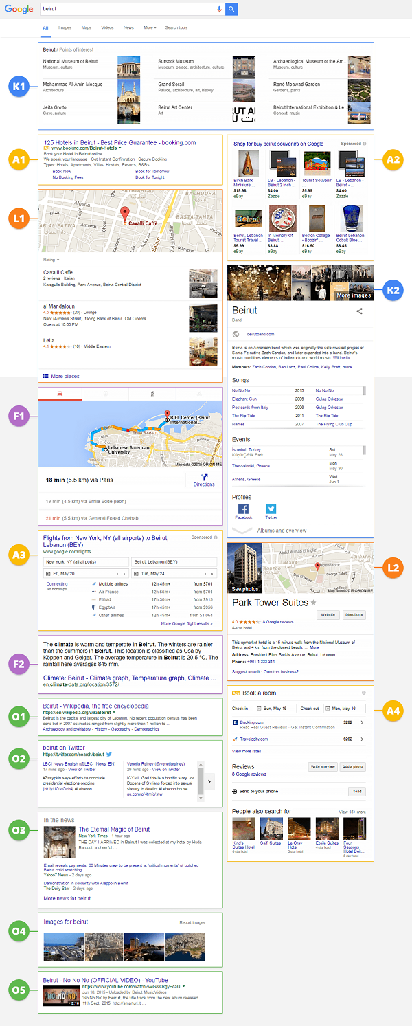 برای تکمیل این مقاله و درک بهتر کاربران راکت از مفهوم serp یک تصویر آماده کردم، البته این یک serp واقعی نمیباشد. اما انواع صفحه نتایج جستجو را نمایش داده است.
