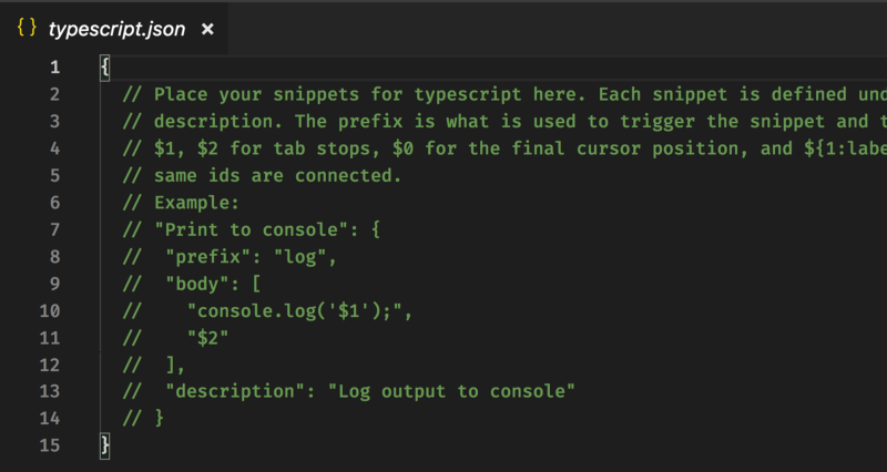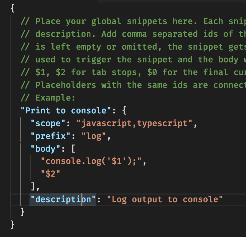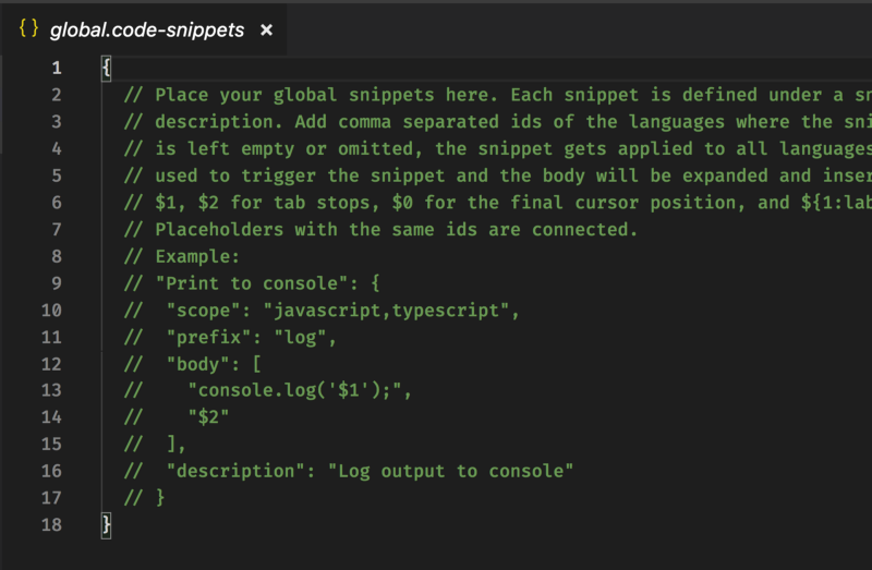 جای اشاره دارد که فایل global خود را global.code-snippets نامگذاری کرد. اگر بعدا میخواهید به این فایل نگاهی داشته باشید، فایل ما خود را در مسیر /Users / <username> / Library / Application Support / Code / User / snippets قرار داده است. ما همچنین میبینیم که هر چیزی یک کامنت را به همراه دارد. البته بخشی از کد وجود دارد که با Example (مثال) شروع میشود، پس بیاید آن را از حالت کامنت در آوریم و نگاهی نزدیکتر به آن داشته باشیم. این بخش چنین ظاهری دارد:
