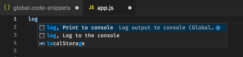 میتوانیم ببینیم که وقتی log را تایپ میکنیم، یک لیست برای ما به نمایش گذاشته میشود. اولین آیتم موجود در لیست، قطعه کد ما است. میتوانید ببینید که ما «Print to console» را به عنوان نام قطعه کد نوشتیم و فیلد descrption ما، برابر با «Log output to console» است. در اینجا ما دکمه «return» را میفشاریم و چنین چیزی را دریافت میکنیم:
