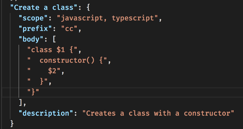 سپس ما به خود قطعه کد، یعنی ویژگی body میرسیم که چند خطی است. ما میتوانیم ببینیم که ما تعداد x عدد را در ویژگی آرایه body خود اضافه کردیم، و این قطعه کد چند خطی شد. مقدار body، فقط چیزی است که ما از یک تعریف کلاس، با یک constructor انتظار داریم. ما دو بخش جالب $1 و $2 را نیز اضافه کردهایم. این دو مورد بعد از ویژگی class، و داخل constructor قرار گرفتهاند. این کار از روی عمد انجام شده است، تا کاربر مجبور به تایپ کردن در کمترین حد ممکن باشد. اولین کاری که شما معمولا به عنوان یک توسعهدهنده انجام میدهید، این است که کلاس مورد نظر را نامگذاری کنید و مقداری کد اولیه به constructor خود اضافه کنید. اگر شما به این ترتیب کارهای خود را انجام نمیدهید، به راحتی میتوانید $1 و $2 را به جایی که برای شما عقلانیتر است، منتقل کنید.