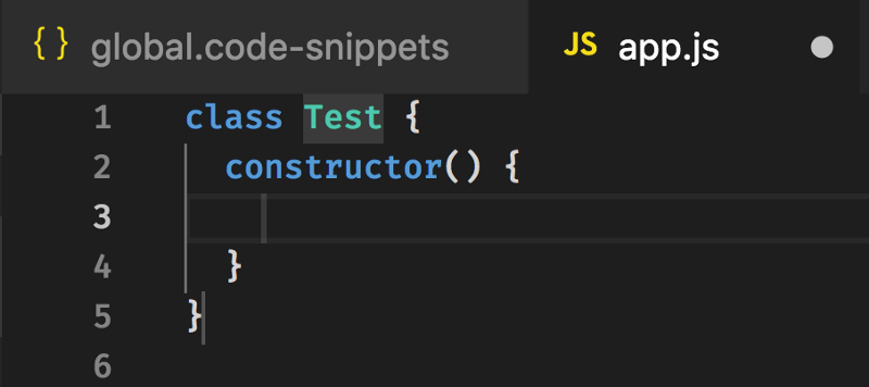 ما میتوانیم ببینیم که Test را به عنوان نام کلاس دادهایم، کلید tab را فشردهایم و مکاننمای ما داخل تابع constructor قرار گرفته است.