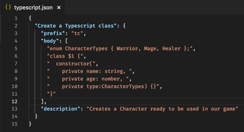 ما میتوانیم ببینیم که این بار، نام فایل کمی متفاوت است. این نام به جای این که چیزی مانند <something>.code-snippets باشد، typescript.json میباشد. پس وقتی که فایل ما با .json به اتمام میرسد، ما در حال کار با یک فایل مختص یک زبان خاص هستیم. جای دارد اشاره کنیم که یک قطعه کد مختص یک زبان، فقط برای آن قطعه کد کار خواهد کرد، پس اگر ما داخل یک فایل هستیم که با .js تمام میشود، امتحان کردن مقدار prefix ما، آن را فعال نخواهد کرد. در عوض برای این که قطعه کد ما قابل انتخاب باشد، ما باید داخل یک فایل .ts باشیم.