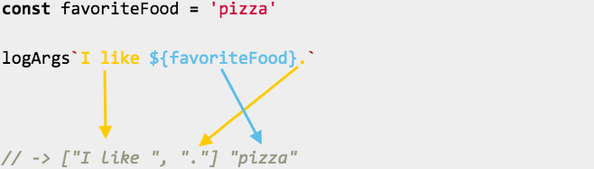 logArgs(`I like ${favoriteFood} and ${favoriteDrink}.`)