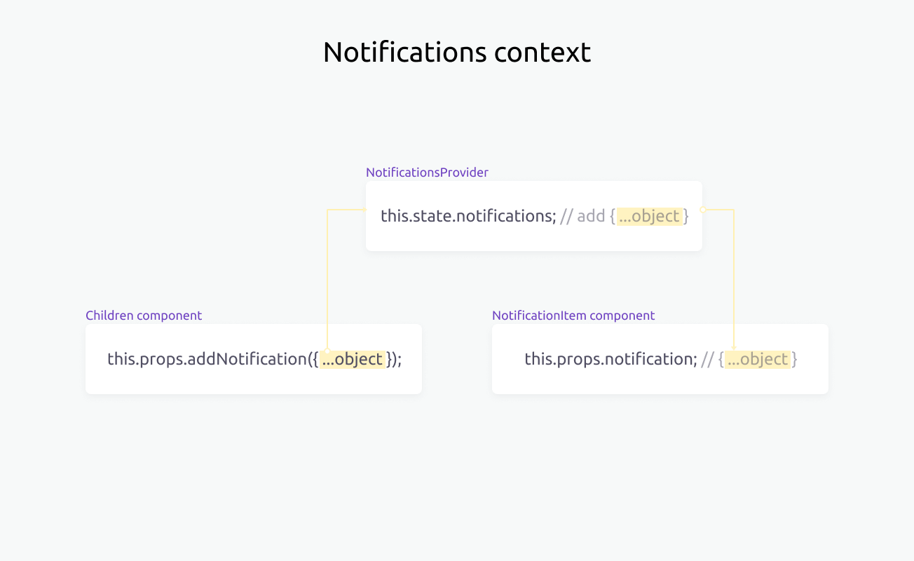 زمانی که هیچ هوکی در React وجود نداشت، من در حال یادگیری context بودم و سعی میکردم چیزهای سادهای که این API به من میداد را درک کنم. کانتکست در React از دو کامپوننت اصلی استفاده میکند و اطلاعات را از کامپوننت Provider به کامپوننتهای فرزند خود (Consumer) منتقل مینماید. سپس بعد از آماده کردن شی با متدها و دادهها، آن را برای Provider ارسال کرده و برای تمام کامپپوننتهای سطوح پایین در دسترس قرار میدهد.