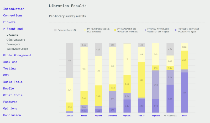 برای این قسمت از بررسی JavaScript، من خواستم که کمی عمیقتر بروم و نه تنها بدانم که مردم از کدام ابزار و کتابخانهها استفاده میکنند، بلکه بدانم چرا از آنها استفاده میکنند.