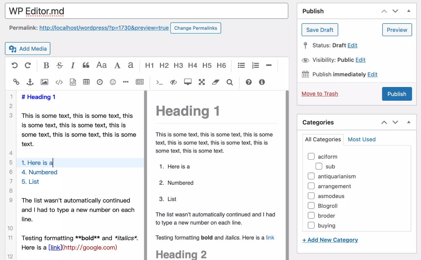 WP Editor.md یک ویرایشگر Markdown وردپرس همراه با برجستهسازی سینتکس و پیشنمایش صفحه است، اما متأسفانه مستندات بسیار کمی برای آن وجود دارد. این شبیه رابط WP Githuber MD عمل میکند و از ماژول Markdown در Jetpack برای تجزیه و ذخیره محتوا بهره میگیرد. وقتی پلاگین را تست کردم، لیستها در قسمت پیشنمایش با فاصله دو برابر ظاهر میشدند، اما هنگام انتشار خوب به نظر میرسند.