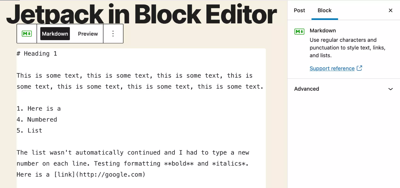 با این حال زمانی که پستها را به HTML تبدیل میکند، به نظر میرسد که در همان قالب ذخیره میشود. این موضوع یکی از کاربرانی که قبلا از Jetpack استفاده کرده بود را ناامید کرد. او از اینکه فهمید همه پستها دیگر در Markdown نیستند، بسیار متعجب شد.