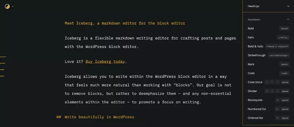 Iceberg یک ویرایشگر نوشتاری منحصر به فرد و انعطافپذیر برای ایجاد پست در Markdown به همراه Block Editor وردپرس است. این به شما امکان میدهد در ویرایشگر وردپرس به روشی بنویسید که بسیار طبیعیتر از کار با بلوکها است. همانطور که خودش اذعان دارد: