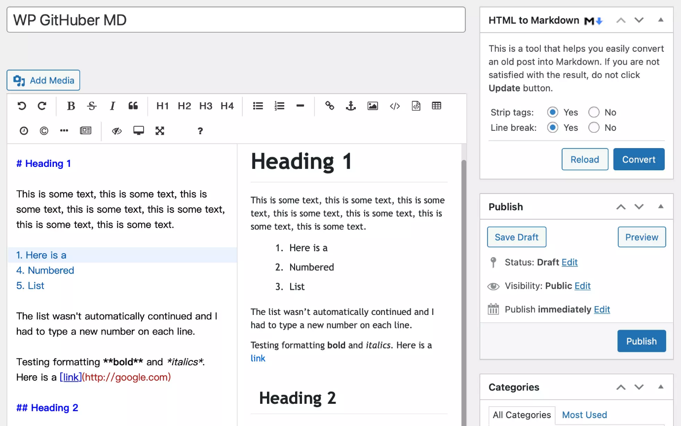 علاوه بر این یک نوار ابزار در بالای ویرایشگر ارائه شده که شامل آیکونهایی برای قالببندی، هدرها، لیستها، لینکها، تصاویر و موارد دیگر است. وقتی پلاگین را تست کردم، متوجه شدم که لیستها به طور خودکار با فشار دادن اینتر ادامه نمییابند و یک عدد، خط فاصله یا ستاره جدید باید در هر خط تایپ شود.