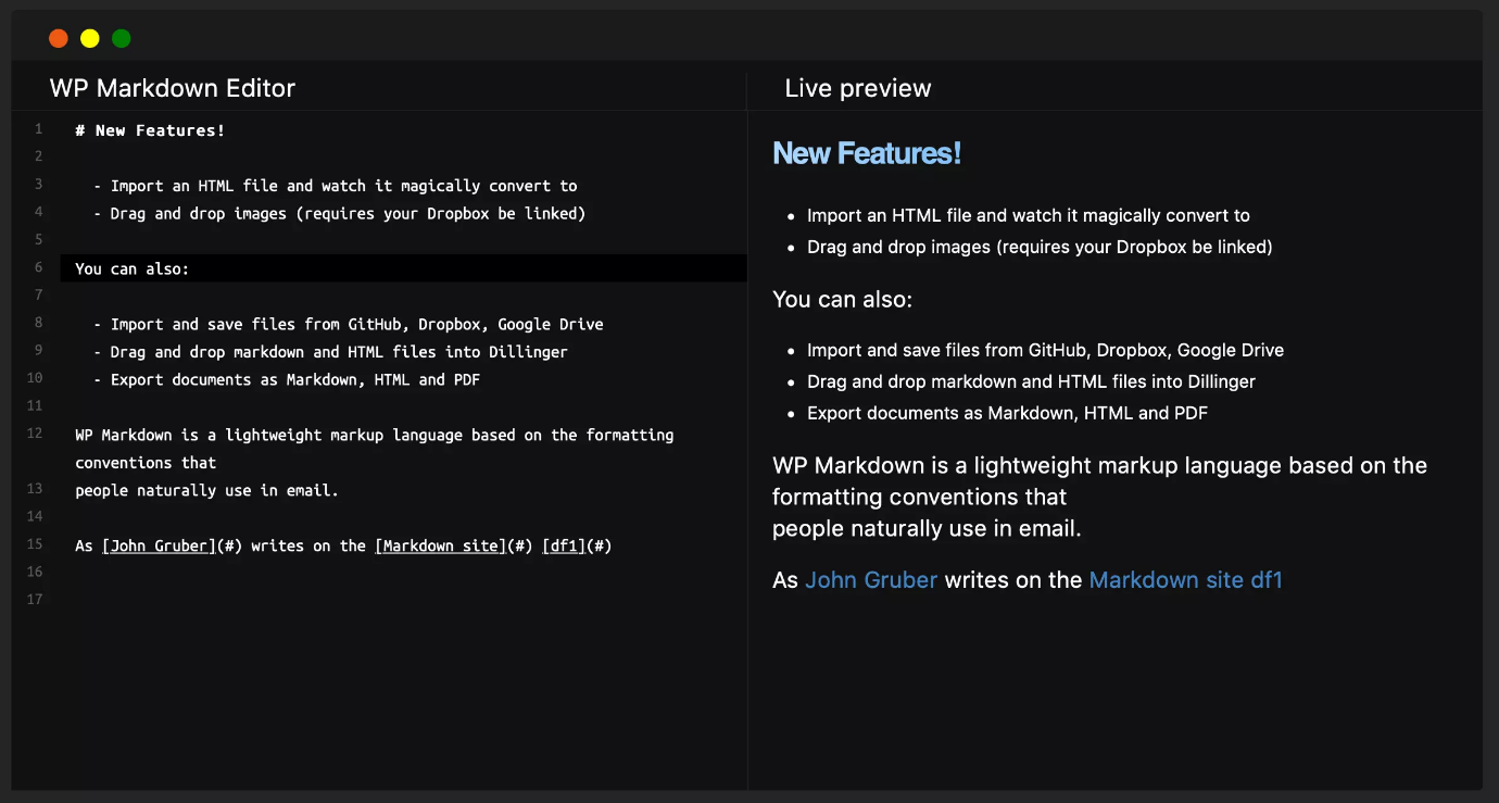 WP Githuber MD یک پلاگین Markdown همه کاره است که از GitHub Flavored Markdown استفاده میکند. این در حال توسعه فعال است و قابلیتهایی مثل برجستهسازی سینتکس، پیش نمایش لایو صفحه، بررسی املایی، چسباندن تصویر و تبدیل HTML به Markdown را پشتیبانی میکند. به علاوه Markdown را میتوان به صورت جداگانه برای هر پست فعال یا غیرفعال کرد.