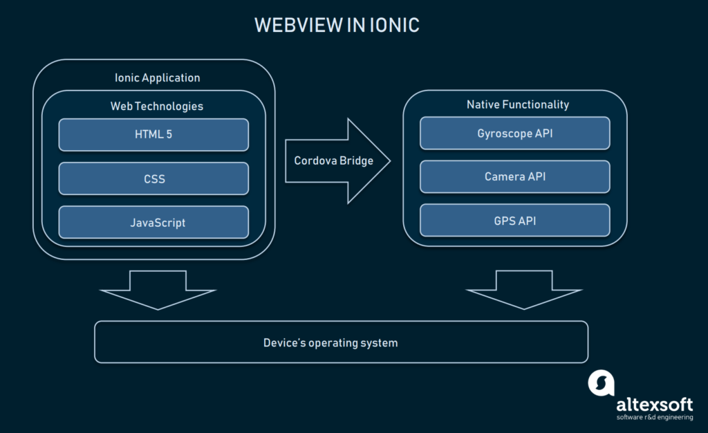 Ionic از تکنولوژیهای فرانت-اند مانند HTML، CSS و Javascript استفاده میکند. همچنین برای توسعه اپلیکیشنها از فریمورک Angular نیز بهره میگیرید. در حقیقت شیوه کاری Ionic به این صورت است که شما اپلیکیشن مورد نظرتان را با استفاده از Angular ساخته و سپس آن را در یک WebView نمایش میدهید. WebView یکی از کامپوننتهای مهم مرورگر است، در Ionic این قابلیت را به شما میدهد تا بتوانید المانهای یک اپلیکیشن مبتنی بر وب را به المان محلی موبایل تبدیل کنید.