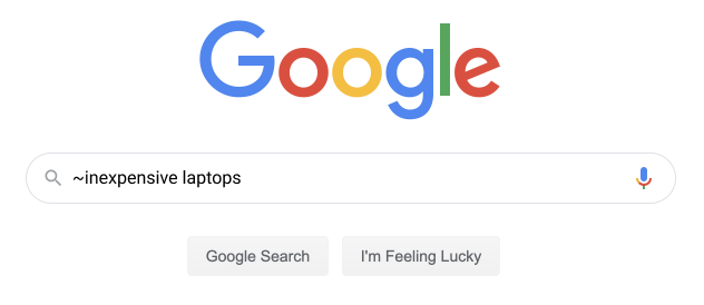 این برعکس یافتن کلمات و عبارات دقیق است. علامت ~ به شما کمک میکند تا مترادفها را پیدا کنید. به عنوان مثال اگر به دنبال لپتاپهای ارزان قیمت هستید، جستجو کردن ~ لپتاپهای ارزان میتواند مفید باشد. این روش زمانی عملکرد بهتری دارد که شما آن را در اصطلاحات عمومی و عباراتی با مترادفهای بسیاری اعمال کنید. شما باید مطمئن شوید که ~ را دقیقا در کنار کلمه مورد نظر قرار دهید. هیچگونه فاصلهای بین ~ و کلمه نباید وجود داشته باشد.