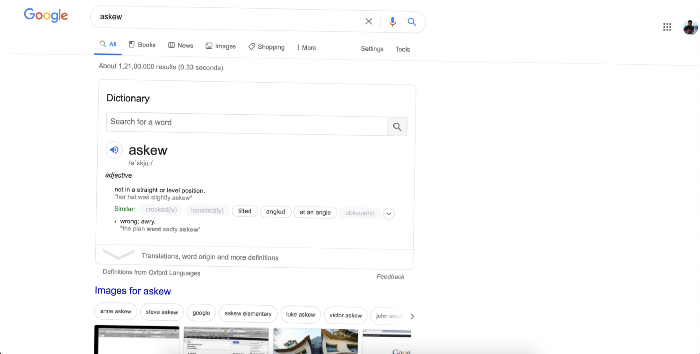 یکی از دوستان خود را پیدا کنید و وقتی روبروی کامپیوتر نشستهاید کلمه "askew" را در گوگل جستجو کنید. نتیجهی این کار را خودتان خواهید دید.