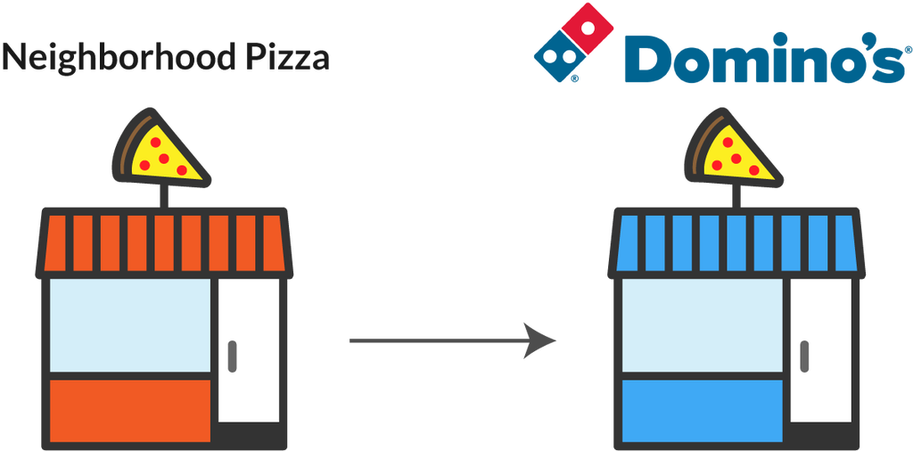 بیایید یک مثال را در دنیای واقعی بررسی کنیم. تصور کنید که در این محله، یکی ازساختمانها، یک پیتزا فروشی به نام Neighborhood Pizza است. Neighborhood Pizza درحال کار و فعالیت است و Domino (یک پیتزا فروشی بزرگ دیگر) تصمیم میگیرد، ملک را بخرد و به جای آن به محله خدمات دهد .