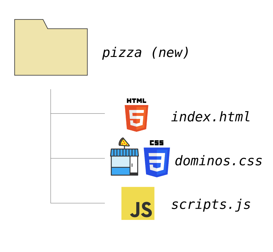 بنابراین، ما اکنون یک فایل CSS جدید ایجاد کردهایم (آن را Dominos.css مینامیم). ما باید پوشهای به نام پیتزا ایجاد کنیم تا نشان دهیم در حال حاضر در مورد پیتزا فروشی صحبت میکنیم و فایل Domin.css را جایگزین پرونده قدیمی styles.css میکنیم.