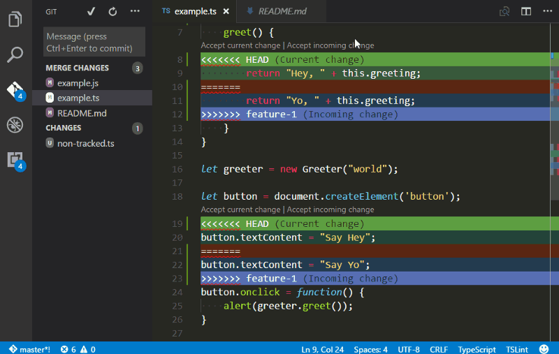 پشتیبانی بهتر از conflict ادغام بصری برای Visual Studio Code, که از افزونه ی merge-conflicts ویرایشگر atom الهام گرفته شده.