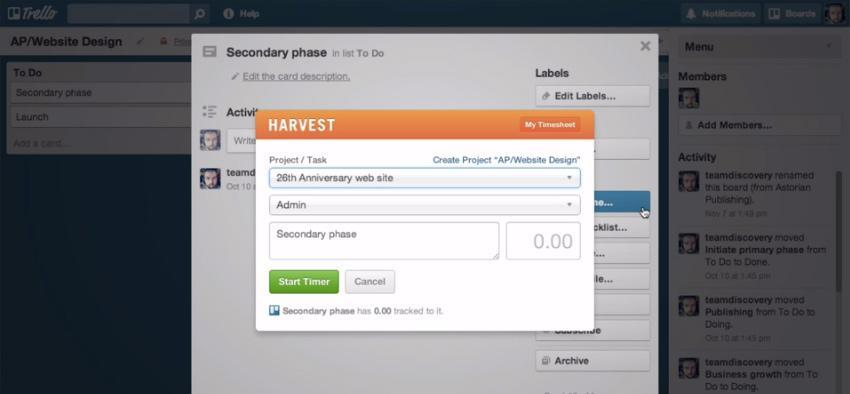 یکپارچه سازی با Trello: ابزار Harvest دارای افزونه ای برای مرورگر کروم است که این اجازه را می دهد تا کاربران در حین انجام کار با سرویس Trello کارشان را بدون خارج شدن از داشبورد Trello انجام دهند. زمانی که این سرویس را با Trello یکپارچه کردید به شما مدت زمان دقیق انجام کار روی کاردهای Trello را نشان می دهد. همچنین برآورد زمانی این سرویس با حساب کاربری شما در Harvest همگام سازی می شود.