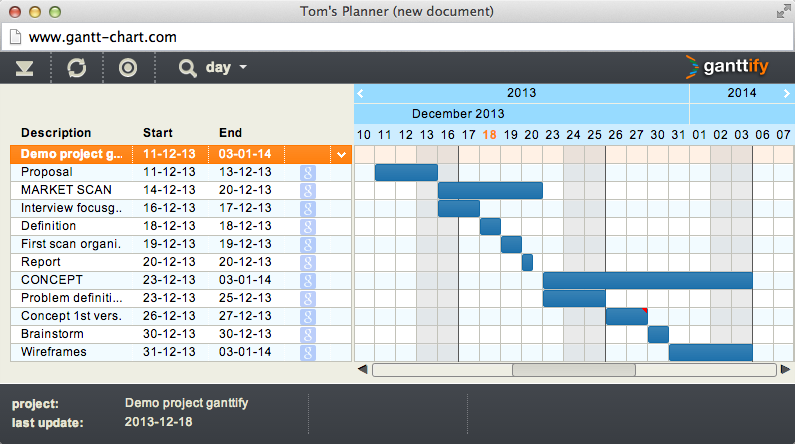 Gantiffy ابزاری ساده است که پروژه های Basecamp، Google calendars و Trello boards را به یک نمودار گانت تبدیل می کند. برای استفاده از این ابزار تنها کافی است با حساب Basecamp، Google و یا Trello وارد سرویس شوید و در بین پروژه های مختلف یکی را انتخاب کنید. در نهایت سرویس برای شما نمودار مورد نظر را تهیه می کند.