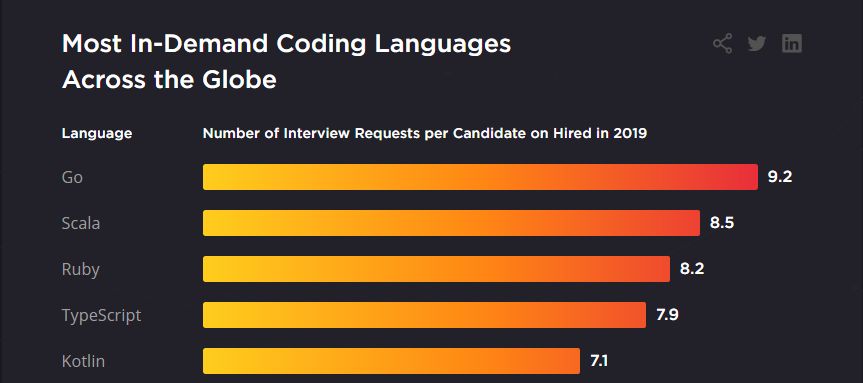 همچنین هر سه زبان برنامه نویسی جایگاه نسبتا بالایی را در همه رتبه بندیها به خود اختصاص دادهاند و در لیست Hired در مکان سیزدهم تا پانزدهم جدول بودند.