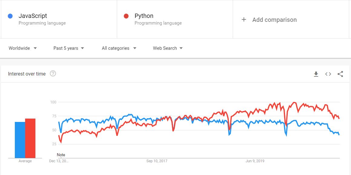 همانطور که میبینید پایتون در 5 سال گذشته از جاوااسکریپت پیشی گرفته است. علاوه بر این، طیف گستردهای از برنامهها در توسعه وب و دسکتاپ، سرورهای شبکه، یادگیری ماشین، برنامههای دسکتاپ مبتنی بر GUI و علوم داده را پوشش میدهد.