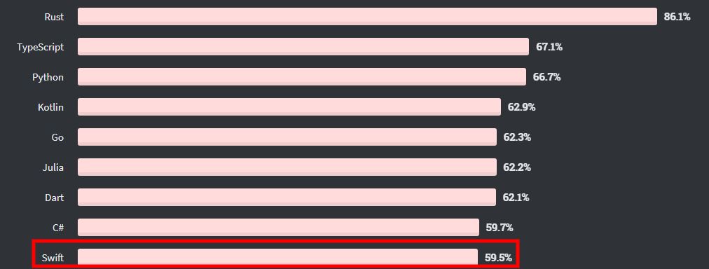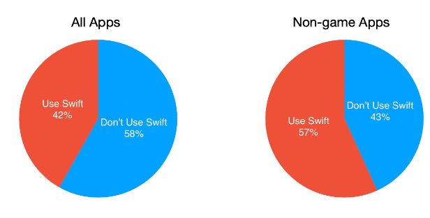 از آنجا که سویفت توسط اپل توسعه مییابد، محبوبیت و پشتیبانی جامعه آن نیز در حال افزایش است. در واقع بررسی 110 برنامه برتر در فروشگاههای معتبر نشان داده که 42 درصد برنامهها از سویفت استفاده میکنند. اگر فقط 79 برنامه به غیر از بازی در نظر گرفته شود، نتایج نشان میدهد که 57 درصد از سویفت استفاده میکنند.